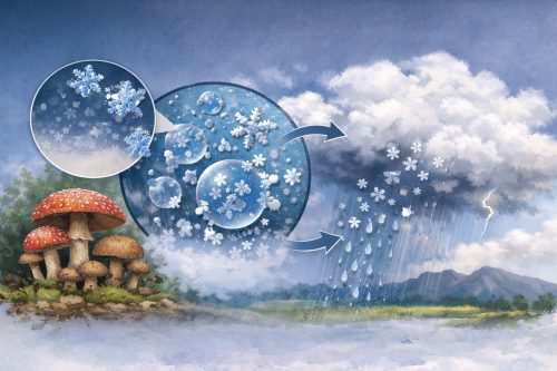 Fisica e biologia, due lati contrapposti dello scibile che interpreta e categorizza l’esistenza. Interconnessi negli effetti ma che possono costituire, in base alle circostanze, l’una o l’altra causa, mutualmente operative nell’imprimere specifiche derive al corso di determinati frangenti. Ed è forse per questo, più di ogni altra ragione, che l’idea umana di poter indurre precipitazioni atmosferiche in caso di prolungata siccità è da sempre stata simile ad un gesto magico almeno fino all’impiego di tecnologie moderne, così per l’approccio delle danze apotropaiche messe in opera in contesti tribali, come nel caso del proverbio americano delle Grandi Pianure secondo cui “La pioggia seguirà l’aratro” favorendo in questo modo il gesto di chi anticipa tramite il lavoro una progressione ciclica del ciclo stagionale. Caso vuole, tuttavia, che esista nella pratica un insieme di creature in grado di favorire in modo pratico questo fenomeno, dote che abbiamo lungamente attribuito a piccoli organismi che si moltiplicano come patogeni del mondo vegetale. Soltanto per venire sollevati, con un alito di vento, fino alle regioni nebulose dei cieli soprastanti. Dove favoriscono, tramite la secrezione di speciali proteine, la concrezione in schegge dell’umidità latente. Esatto: esistono batteri che possono costruire il ghiaccio. Che poi ricadono, liquefacendosi, per dissetare l’arido terreno sottostante. Soltanto grazie a un nuovo studio di scienziati appartenenti alla Boise University e il Virginia Tech, ora sappiamo in quale modo esatto certi esseri fungini possono riuscire a compiere la stessa impresa. Con finalità e un approccio differenti, calibrati sulla base di uno stile di sopravvivenza differente. Ma la stessa origine remota lungo l’albero pregresso dell’evoluzione, avendo incorporato, come ipotesi dal più elevato grado di pertinenza, tale propensione dalla flora batterica dei propri antichi predecessori. Dimostrando l’esistenza di un trasferimento genetico tra organismi tanto lontani, nei fatti, da non vantare casi precedenti a cui ispirarsi. Il che porta ad una serie di rivelazioni, sul funzionamento della vita fungina e il modo in cui può risultarci utile, che lo studio esamina in maniera approfondita. Soprattutto per quanto concerne il micelio saprofita del genere Mortierella e la muffa filamentosa Fusarium, il cui possesso della sovraesposta prerogativa permetterebbe, in base alla logica contestuale, di favorire una ripetizione ciclica da formazione del corpo fruttifero, sollevamento delle spore fino ad una quota sufficiente ad alterare la vigente meteorologia. Da cui la creazione di quel suolo umido, di per se stesso favorevole all’attecchimento della prossima generazione fungina…