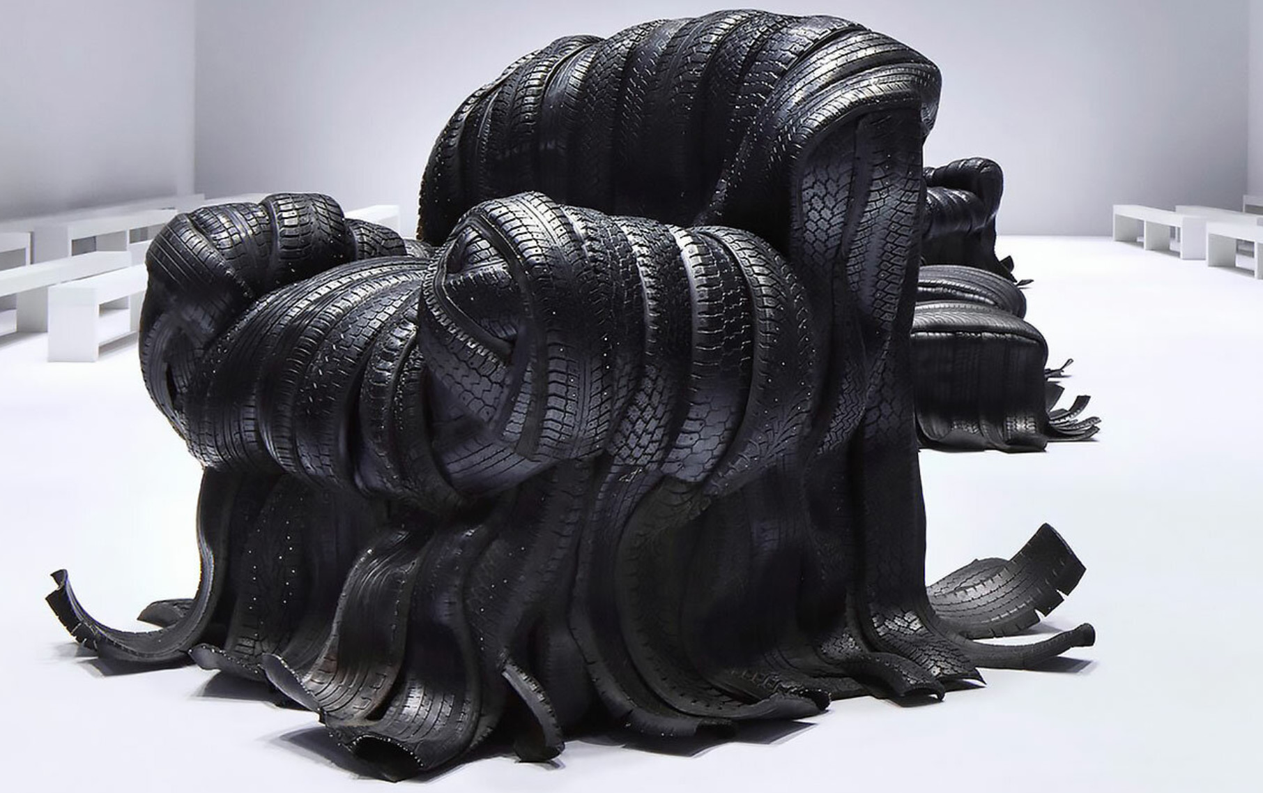 Un vezzo del tipo frequentemente perseguito e soddisfatto dal suo autore, famoso per le installazioni monumentali ed il particolare rapporto che risulta in grado di instaurare con materiali atipici trasformati nell’equivalenza ben visibile di atomi sottoposti ad un processo di aggregazione. O strati modulari, soltanto in apparenza disordinati, che compongono armoniose e inconfondibili figure. Ciò a partire, per quanto sia possibile ricostruire un repertorio sulla base delle informazioni reperibili online, dai suoi contributi risalenti agli anni ’90 per il parco scultoreo di Pirkkala, concepiti primariamente in metallo come il personaggio antropomorfo in ghisa del celebre Homo Birkkalensis. Per poi disegnare una famosa traiettoria, che l’avrebbe accompagnato gradualmente attraverso alcune delle manifestazioni più durevoli della materia. Di cui gli pneumatici chiaramente possono costituire, dal punto di vista prettamente quantitativo, uno dei periodi maggiormente iconici e duraturi…