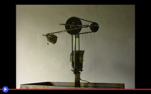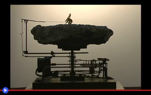 Ganson è per questo il tipo d’inventore, raro e prezioso, capace di accompagnarci in ogni passo del suo metodo primario di ragionamento. Avendone disposto gli scalini come progressione ben visibile, all’interno ed esterno del mirabile consorzio di elementi transitati dalla porta del suo laboratorio. Oggetti che perseguono un preciso e indubitabile obiettivo, sebbene non sia sempre semplice, o in alcun modo necessario, rendere palese quale possa esserne la rilevante natura. Vedi l’esempio forse maggiormente celebre del suo lavoro, già trattato in precedenza tra le nostre pagine, della “Macchina con Cemento” del 1989, apparato fondato sulla concatenazione progressiva una serie di 12 ingranaggi progressivamente più lenti, ottenendo un tempo teorico di rotazione per l’ultimo di questi misurabile in oltre un trilione di anni. Tanto da aver potuto procedere alla sua immobilizzazione, nell’inamovibile blocco pietroso, senza inficiarne in alcun modo l’opportuno funzionamento. Un tema, questo metodo dialettico per affrontare la presciente concatenazione tra il chiaro e l’imponderabile, che ritorna nella tipica complessità di un intero filone delle opere, tra cui “M. con mosca” in cui dozzine d’ingranaggi creati manualmente con piegature e saldature di filo metallico cooperano per ottenere il movimento sorprendentemente semplice di un insetto al termine di un’asta rotante; o il più recente “Prima nobile verità” in cui un fantoccio antropomorfo viene infastidito dall’urto ripetuto sulla nuca di un bastoncino, animato da una sproporzionata e iper-complessa serie di meccanismi frutto della stessa comprovata abilità manuale. Volendo dichiaratamente dimostrare il principio secondo cui non importa quanto possa essere difficile, l’Universo troverà sempre il modo d’infastidirti… Ma è forse proprio il modo in cui è possibile affrontare quel principio tramite l’impiego del raziocinio, il punto di partenza di una crescita fattiva che conduce alla chiarezza nel disordine, il pensiero filosofico di una mente che riesce a interpretare la trasparenza. Più volte veicolata nel catalogo pregresso dell’artista di Hartford, per il suo utilizzo interessante di un oggetto familiare come la sedia, da lui trasformata in metafora dell’uomo fermo e dunque intento, necessariamente, a pensare. Vedi “Thinking Chair” (2007) consistente dell’oggetto intento a muoversi in un cerchio sopra un masso, creando a lungo termine una serie di solchi. O “Machine with Chair” (2009) in cui l’orpello ricorrente viene posto al termine di palo semovente, per fargli compiere le rotazioni e rivoluzioni di un pianeta cosmico, alludendo nuovamente all’infinito. Associazione nuovamente centrale nell’iterazione successiva “L’altro gatto di Margot”, dichiarato omaggio alla sua insegnante di storia dei tempi di scuola, in cui un giocattolo raffigurante l’animale domestico della professoressa è situato lungo il passaggio di un’altra sedia orbitante, modificata ed influenzata nel corso del proprio tragitto dalla sua immota presenza.