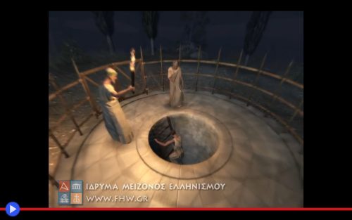 Qui nelle profondità delle tenebre senza tempo sarebbe stato presto rimosso dalla memoria collettiva, se non fosse per l’intercessione rinnovata dell’Oracolo di Apollo. Il quale per il tramite della sua Pizia, interrogata in merito a una grave carestia in Beozia, disse ai richiedenti che l’unico modo per salvarsi sarebbe stato rendere di nuovo omaggio ad una figura dimenticata della loro storia. Allorché un agricoltore di Lebadeia, seguendo delle api ai margini di un campo, si sarebbe imbattuto nella grotta leggendaria dove risiedeva lo spirito di Trofonio. Mentre in una differente interpretazione, sarebbe stata proprio sua figlia, rimuovendo una pietra sotto cui si era nascosta la sua oca, a lasciar scaturire miracolosamente il fiume eponimo tramite cui vengono tutt’ora irrigati i campi della regione. Fatto sta che come effetto collaterale dell’uno o dell’altro episodio, la misteriosa voragine sarebbe diventata il fondamento dell’ignoto sistema di considerazioni e credenze dogmatiche, necessario alla fondazione di un nuovo sito oracolare nella Grecia antica.