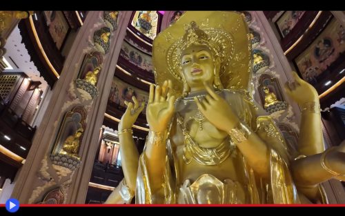 Sarà ormai palese a questo punto come, nella sua iterazione odierna, il sito incarni più di un’anima allo stesso tempo. Quella di un solenne luogo di pellegrinaggio ma anche un tipo di attrazione turistica, con i colori sgargianti e l’eccezionale eclettismo dell’edificio aggiunto, in coordinazione con l’asse tradizionale delle strutture della Porta di Montagna, la Torre Campanaria, la sala dei Sangharama, di Mahavira e dei Patriarchi. Laddove essi stessi vantano importanti concessioni alla visione della religione contemporanea, con pluralità di statue appartenenti ai credi geograficamente compatibili, incluso un angolo dedicato a Caishen (财神) il dio taoista della ricchezza, come di consueto affiancato dai propri attendenti celesti nonché celebrato tramite la vasta quantità di alberi votivi della fortuna, acquistati e disposti dai fedeli innanzi al suo maestoso cospetto. Notevole, di fronte ad esso, anche il diorama nella stessa sala, che tramite una prospettiva incombente sembra offrire uno sguardo privilegiato all’aspetto di questa terra di lacrime e le Terre Pure che ci aspettano all’estremità del nostro lungo percorso. Così come la figura di Guanyin con le proprie molteplici mani dorate, aperte ad accogliere e consolare i fedeli. Ma è procedendo fino alla pagoda propriamente detta, che il fedele viene trasportato letteralmente all’interno di un luogo fuori dalle ragionevoli aspettative pregresse: allorché l’edificio nei fatti più simile concettualmente ad uno stupa, che si eleva in senso verticale dal terreno, rivela al proprio interno la giganteggiante statua dai tre volti e dieci direzioni della Dea in questione, doverosamente circondata da 108 versioni più piccole, corrispondenti agli altrettanti stati della sofferenza umana. A lei profondamente familiari, così come il modo necessario a renderli distanti, nella via effettiva che conduce alla rivelazione e trascendenza universale della mente.