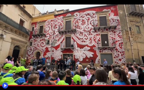 Fu da molti punti di vista, l’evento più acclamato e memorabile all’inizio dell’estate del 2024. Non il tipo d’intrattenimento concepito per attrarre l’attenzione dei turisti sul piccolo paese di Mirabella Imbaccari nella parte meridionale della Sicilia, bensì un momento introspettivo calibrato attentamente sulle aspettative della gente di qui, indipendentemente dall’età, la storia personale ed il tipo di attività creative capaci di occupare i lunghi pomeriggi delle proprie giornate. Capitale nazionale per l’impiego e perfezionamento del tombolo, questo è il luogo dove più di ogni altro l’effettivo impiego del supporto rigido con i suoi spilli, e le coppie di fuselli e rocchetti sono stati elaborati allo stato pratico di vera e propria forma d’arte popolare. Partendo dall’epoca remota in cui si dice che le suore missionarie, di ritorno in Italia, lo trapiantarono probabilmente dalla Cina, venendo accolte dai principi Biscari nel proprio imponente maniero. Giammai nessuno, tuttavia, nel corso articolato dei secoli XVIII e XIX, avrebbe mai pensato di vederlo riprodotto in questa guisa, delle dimensioni architettoniche di una delle 60 case adiacenti al corso principale della Via Trigona. Su di un fondo rosso acceso, candida e perfetta geometria dei famosi “riccioli e rose”, uno dei soggetti più frequentemente utilizzati come fondamento artistico di plurime ed affascinanti composizioni. Però non costruito tramite l’impiego di una stoffa, così come potrà sembrarvi, bensì tramite l’impego di un sistema all’apice di un contrastante metodo creativo: l’utilizzo della bomboletta di vernice candida, interfaccia idealizzata tra le braccia dell’artista e la tela verticale di quel muro elevato. Verticalità imponente, delicatezza ed eleganza procedurale. Concetti tipici dell’arte veicolata dall’artista polacca di Varsavia NeSpoon, avvolta dalle tenebre leggiadre dell’anonimato, così come si confà ai comuni praticanti dell’arte dei graffiti, spesso utilizzati come strumento di lotta sociale o difformità da regole ed imposizioni provenienti da troppo lontano. Una missione che rientra in senso metaforico nella prassi di colei che calibra il proprio messaggio su questi princìpi operativi, volutamente disallineati dal programma di coloro che soggiornano su entrambi i lati della barricata contemporanea.